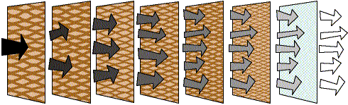 därmed nås största möjliga kontakt mellan filterytaoch de färgpartiklar som ska fångas in. Varje lager har dessutom en ökande täthet,